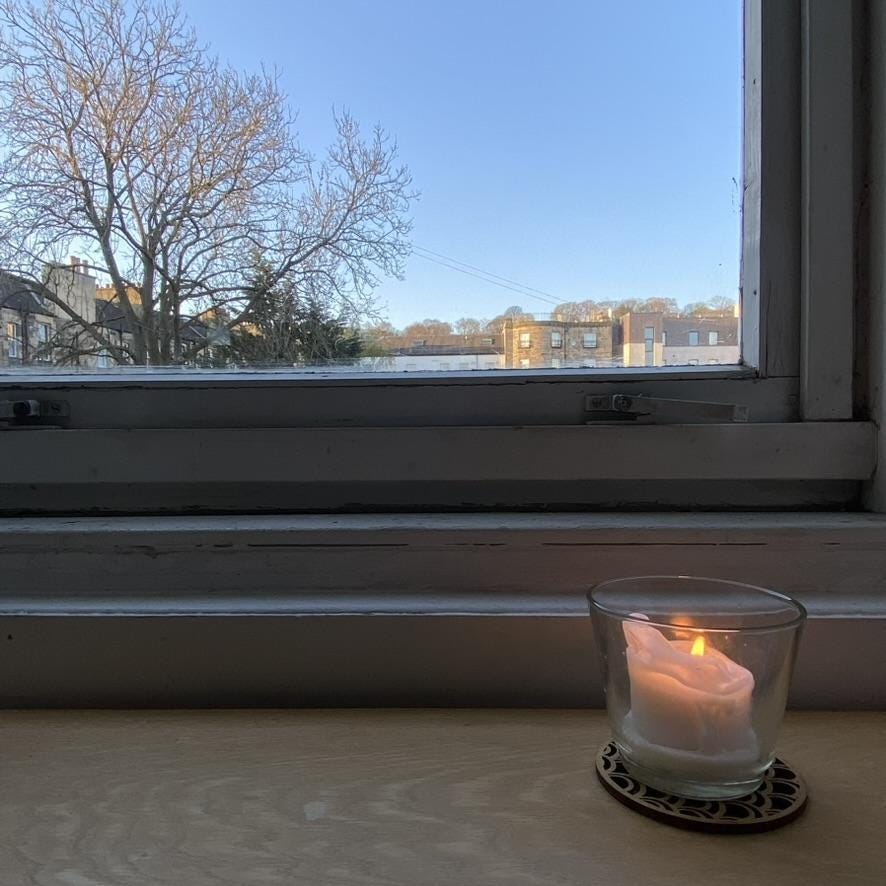 A lit candle reminds me of gifts and mysteries beyond anything I can control and often beyond what I can see. It gives a clear nod to things that sustain and nourish me – at the most basic level: oxygen, light and warmth. Its presence reminds me I’m part of and held within a wider ecosystem. I find this a reliable lens through which to approach the day.