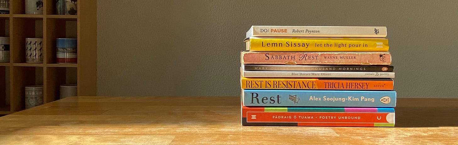 Poetry is an easy go-to for me as a way of inhabiting a pause. If you need a place to start, Mary Oliver (for example, her ‘Blue Horses’ or ‘A Thousand Mornings’) and the short yet spacious ‘Poetry Unbound’ podcasts (and book) with Pádraig Ó Tuama remain firm favourites and are accessible places to begin. For little snippets each morning, Lemn Sissay’s ‘Let the Light Pour In’ is a treat.